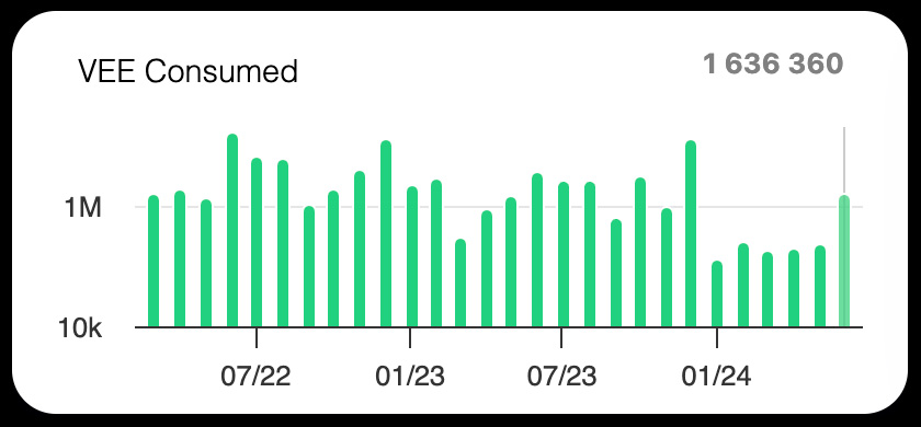 A total of 1.6 million $VEE were consumed in June, an 830% increase from the average of 197,000 since January 2024.