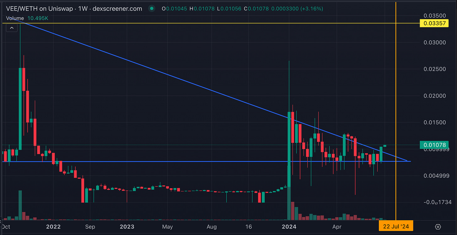 The orange vertical bar mark the beginning of the 2024 Paris Olympics, where some community members speculate that $VEE will play a significant role, aligning with the end of the consolidation pattern.