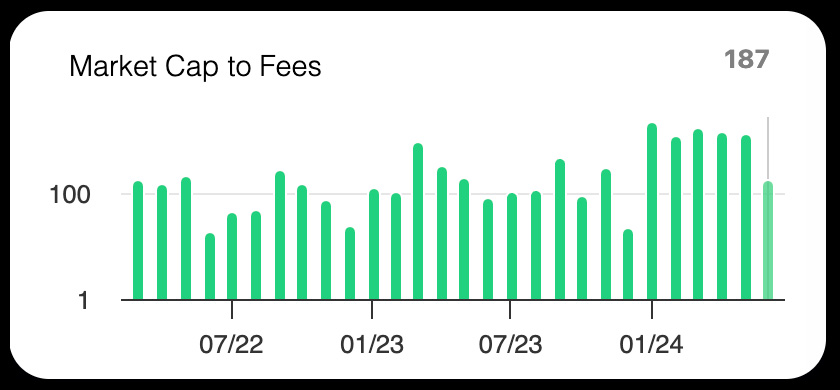 The Price/Fee Ratio in June was 187, an 89% decrease from the average of 1,611% since January 2024. A lower value is better for this metric.