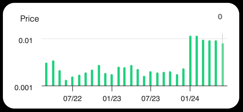 Following a period of compression from January 2022 to January 2024, $VEE broke out of its previous price resistance of $0.0075, reaching a local top of $0.0265, just 11% below its 2022 high. Since the breakout, the token has been in a consolidation pattern with increased monthly trading volume.